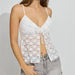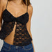 Woman wearing a pink lace tank top and blue jeans against a light gray background
