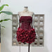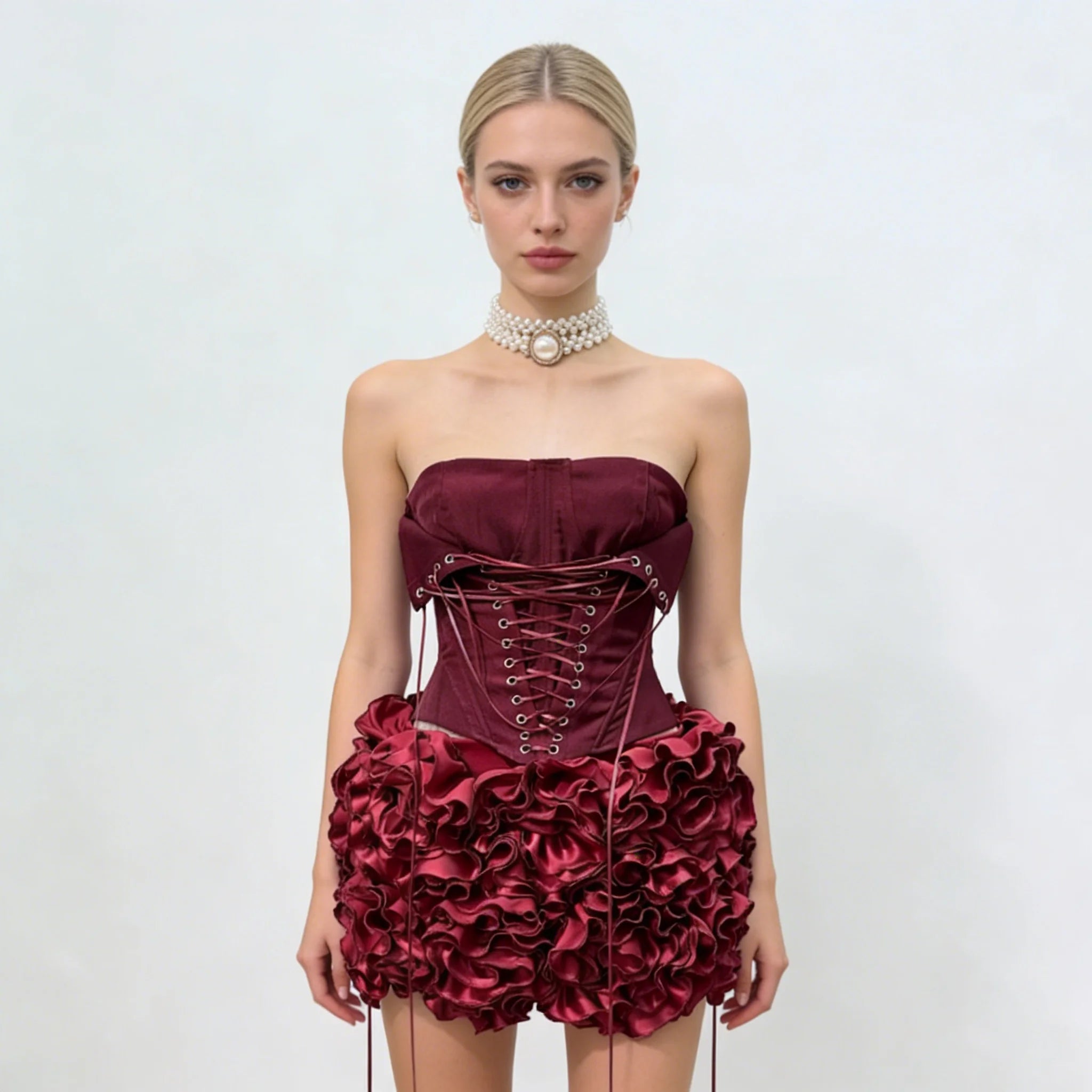 Red Lace Up 3D Flower Corset And Mini Skirt Set