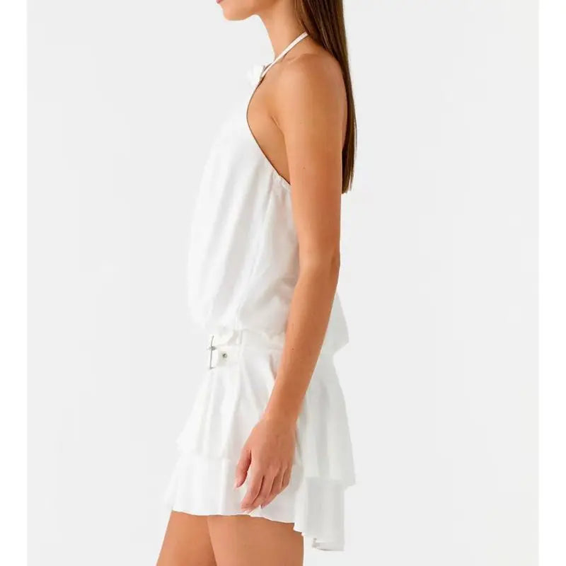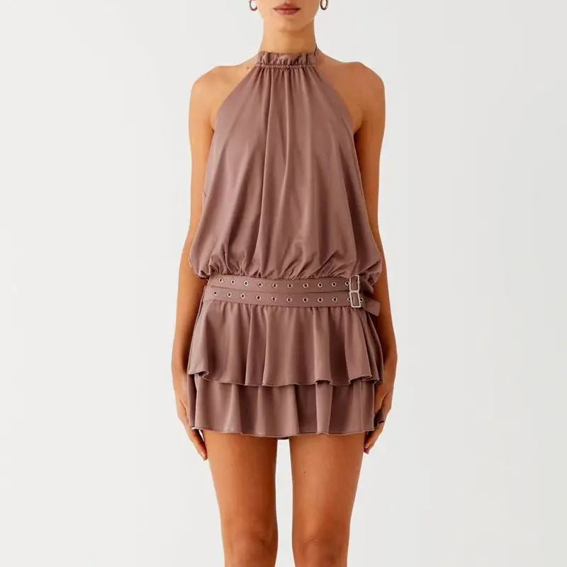 Ruffled Halter Neck Backless Metal Buckled Mini Dress