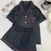 Satin Black V Embroidered Short Sleeve Top And Shorts Pj Set
