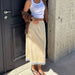 Person wearing a yellow top and brown skirt standing on a street with a building in the background.