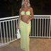 Two women wearing matching strapless tops and sarongs, one in green and the other in white, against a neutral background.