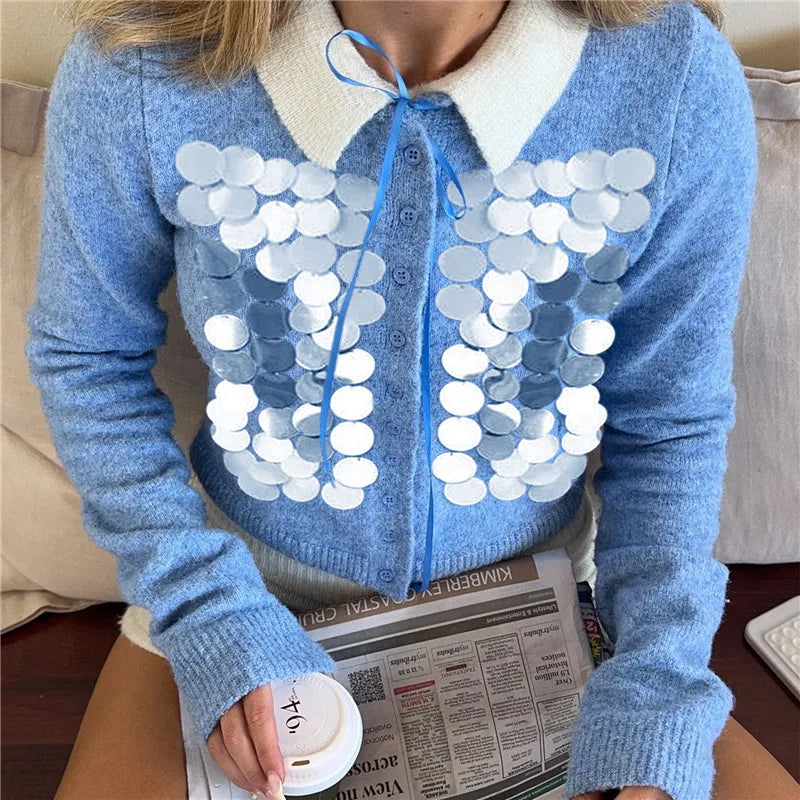 Woman wearing a blue sequin cardigan over a white outfit with red patterns, standing outdoors.