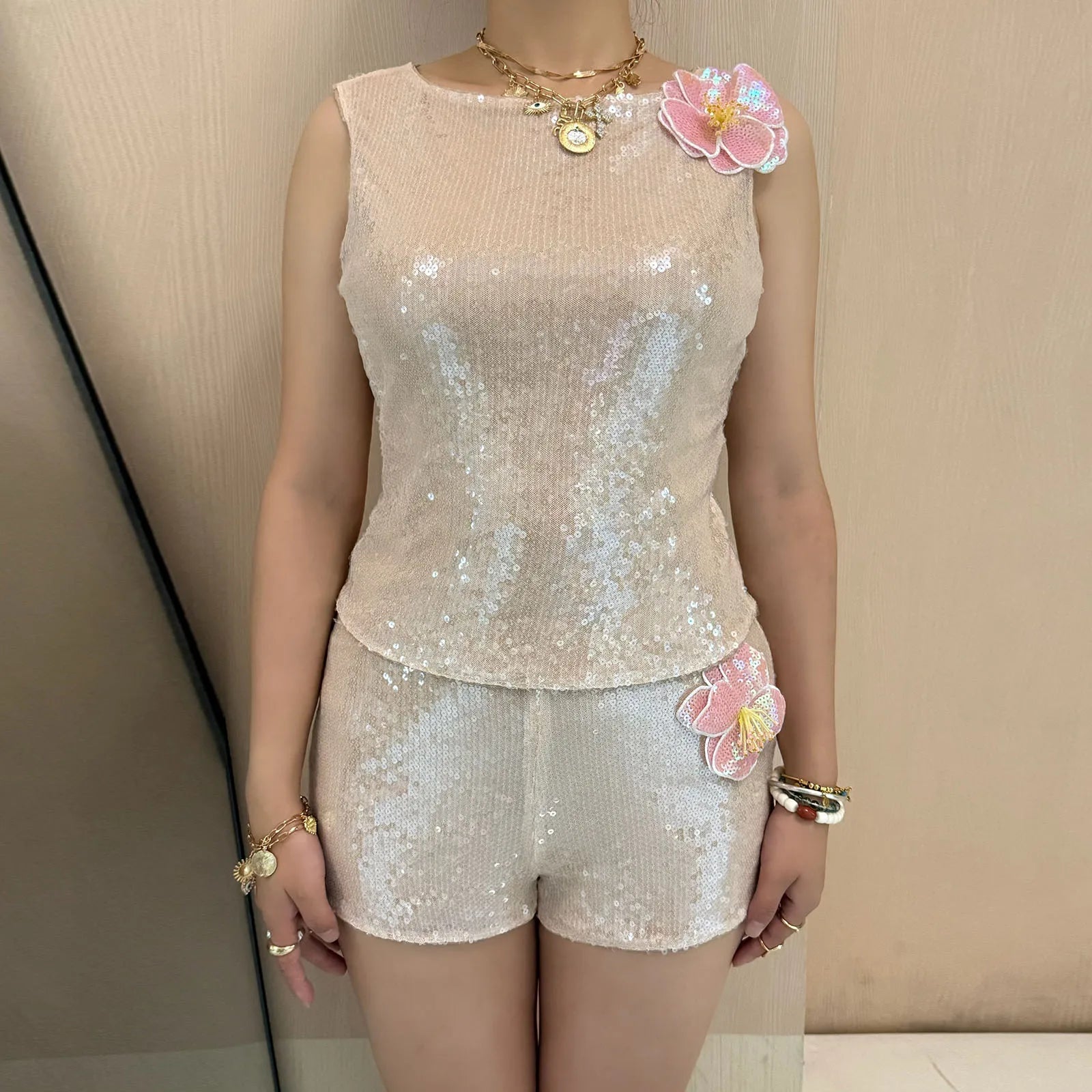 Person wearing a sequined top and shorts set with floral accessories indoors.