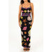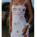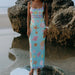 Woman wearing a blue dress with colorful shell and starfish patterns on a beach.