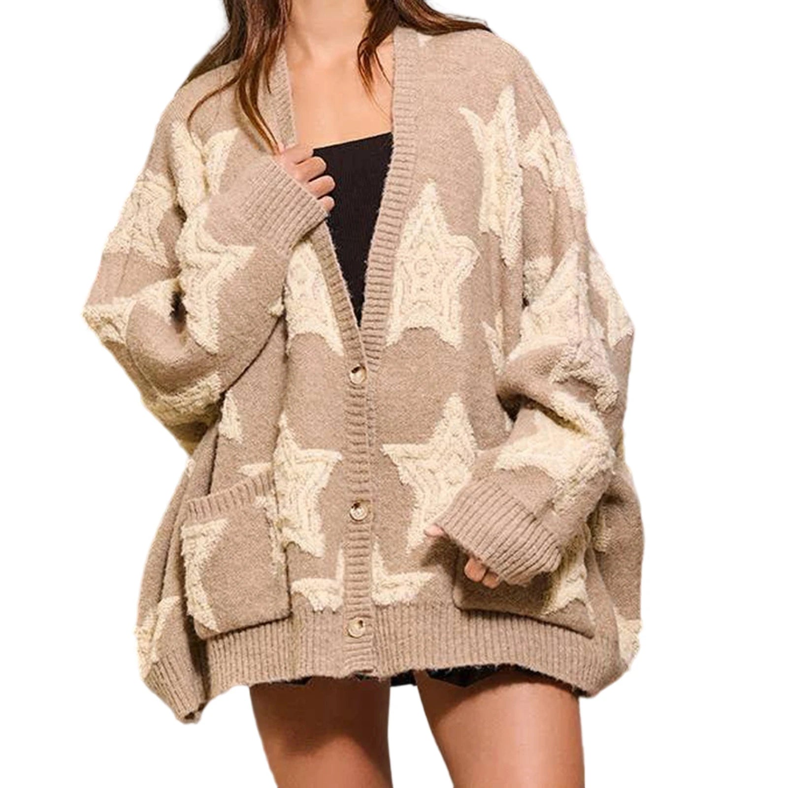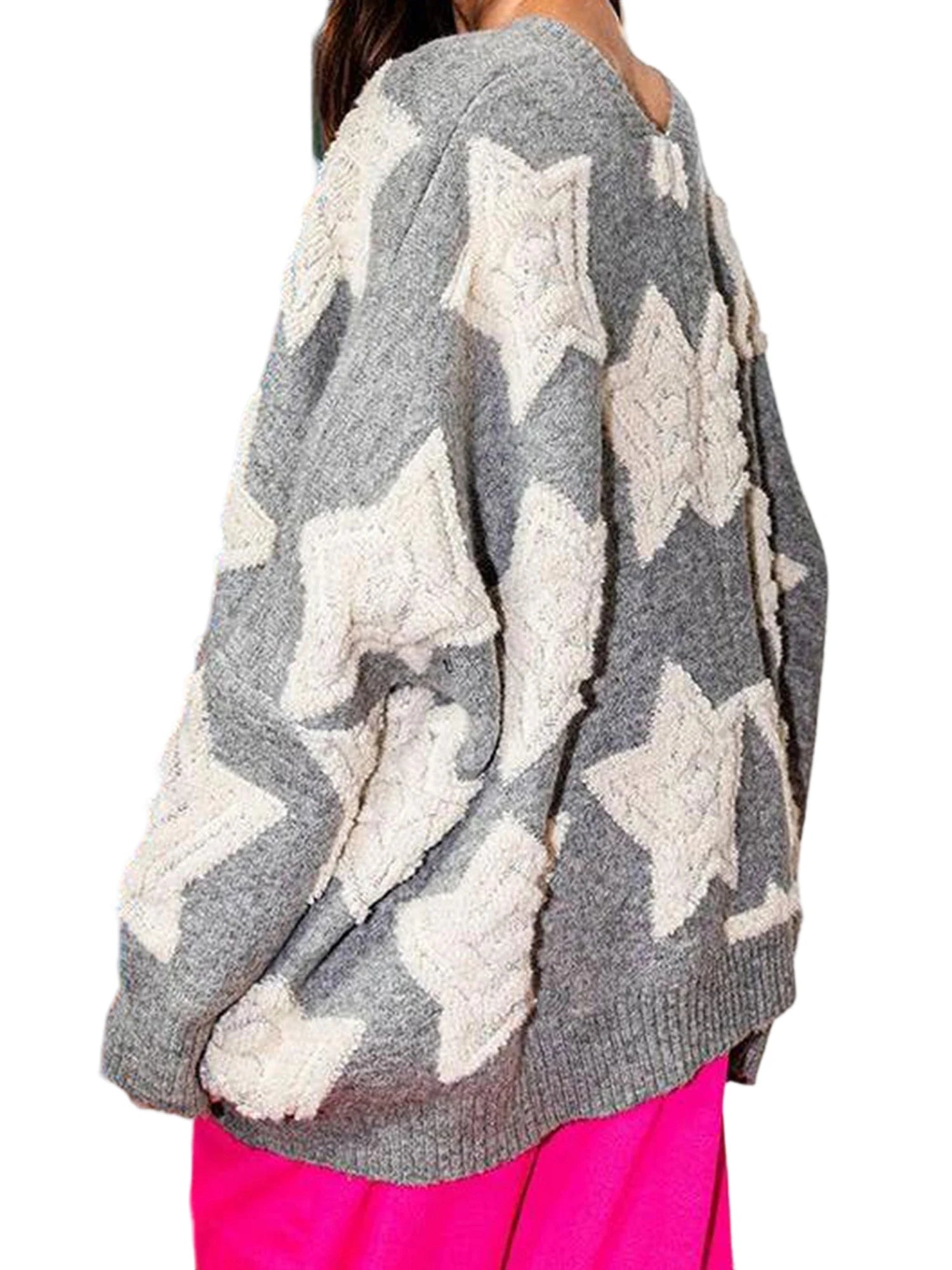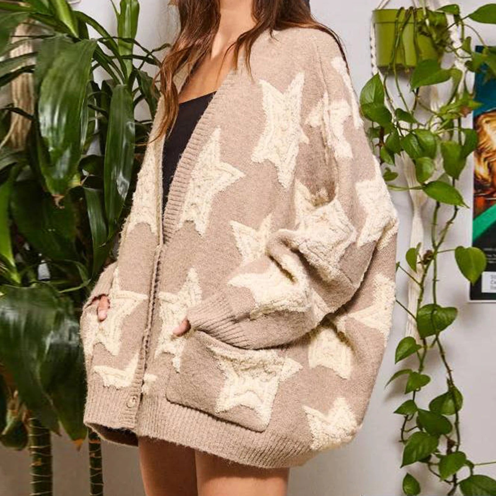 Person wearing a white cardigan with blue star patterns in a casual setting.