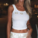 Woman wearing a white tank top with gold designs in an outdoor setting