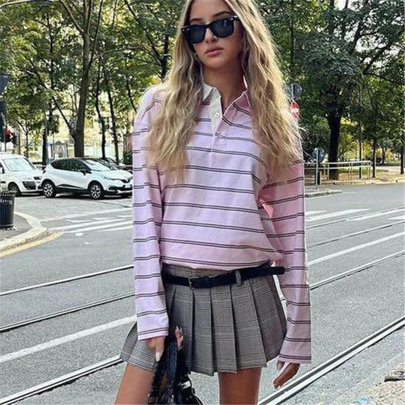 Woman in a striped shirt and skirt holding a light blue handbag against a neutral wall.