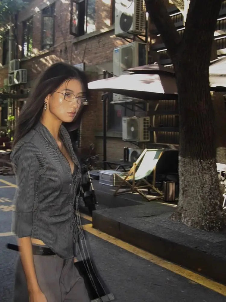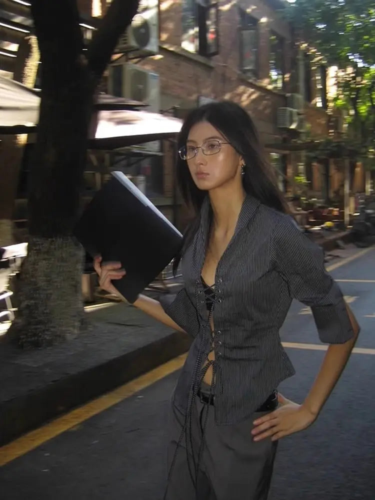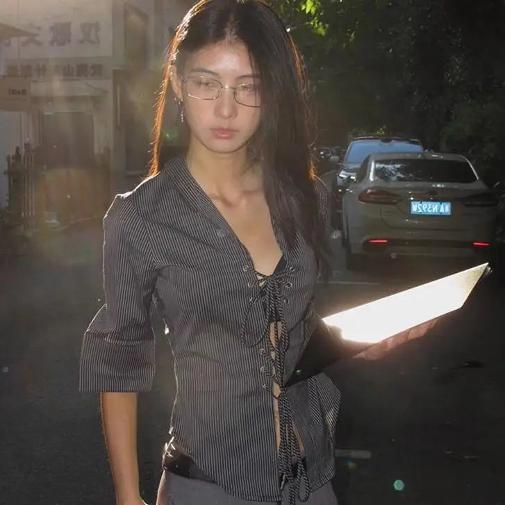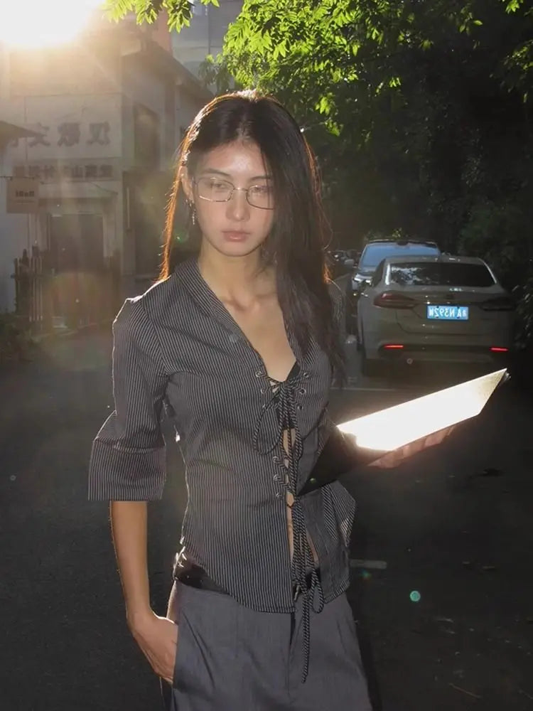 Striped Half Sleeve Lace Up Shirt