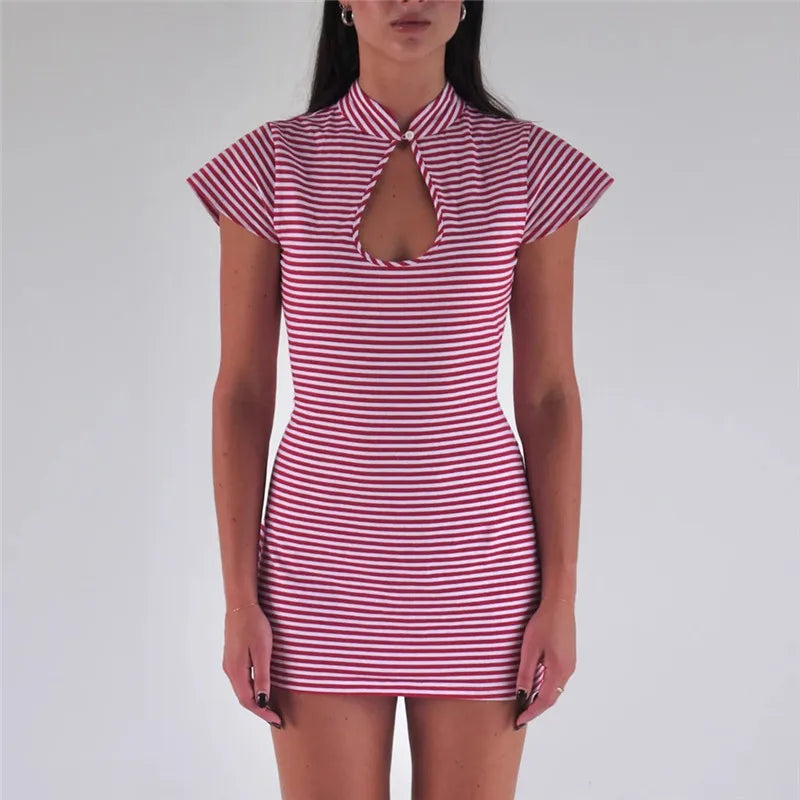Striped Keyhole Neck Cap Sleeve Mini Dress