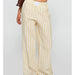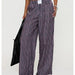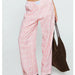 Person wearing pink striped pants holding a brown bag on a light gray background