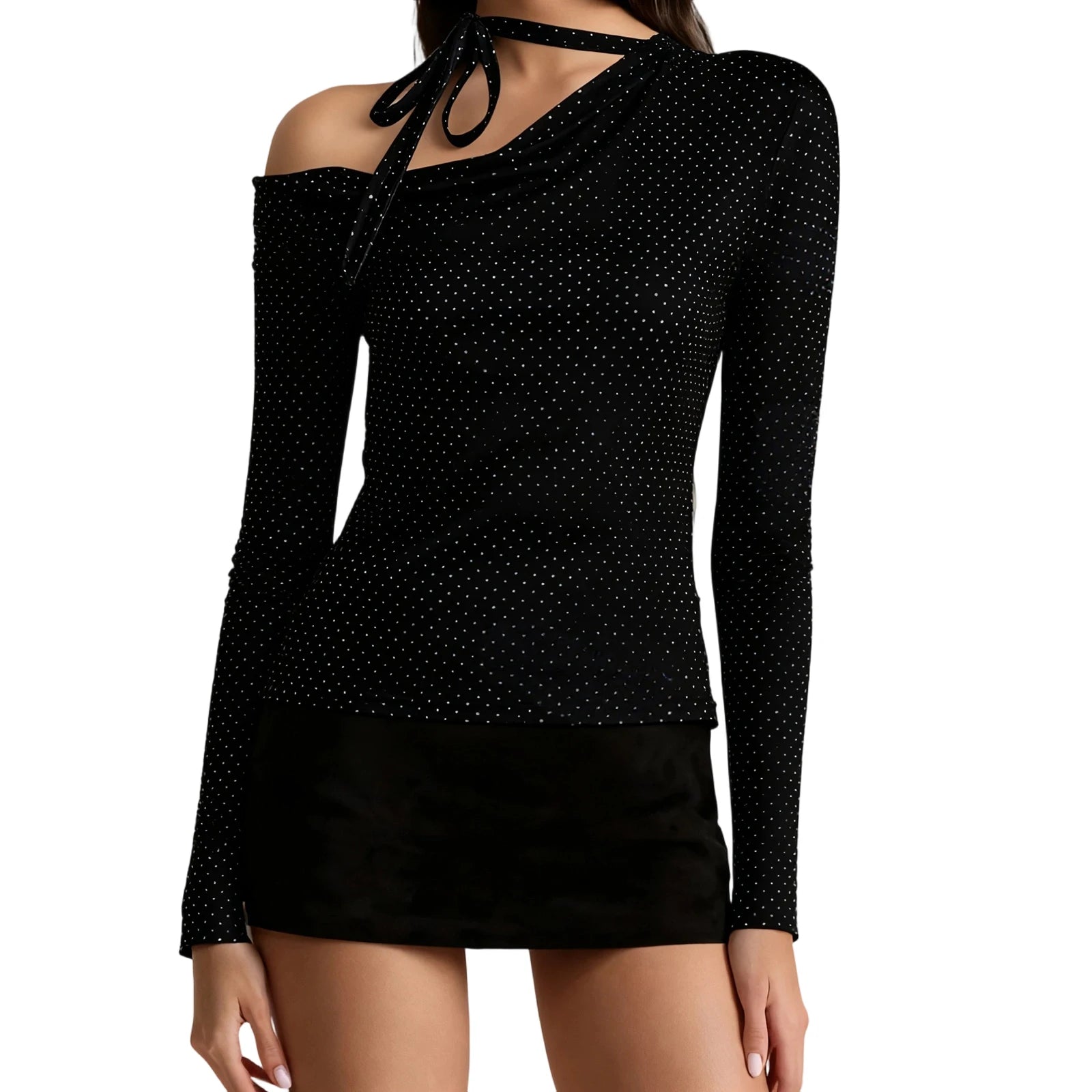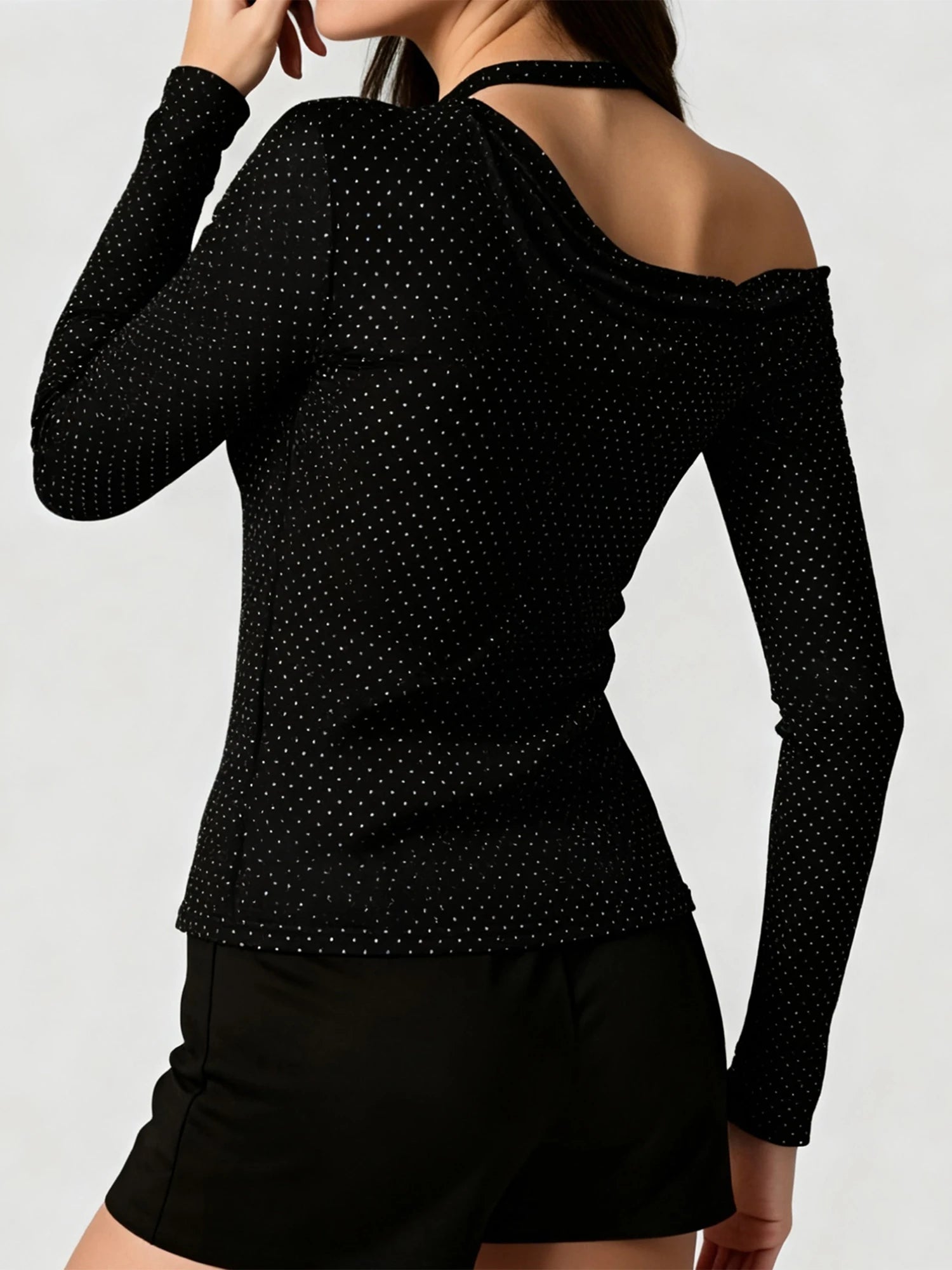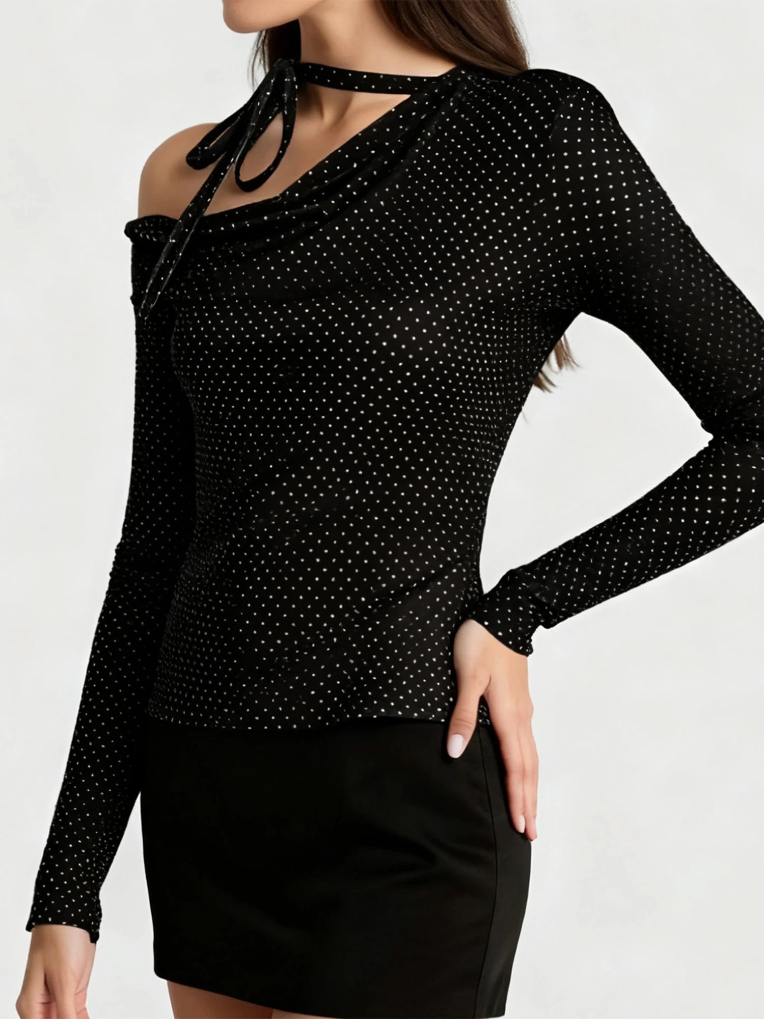 Tie-up Strap Dot Print Off The Shoulder Long Sleeve Top