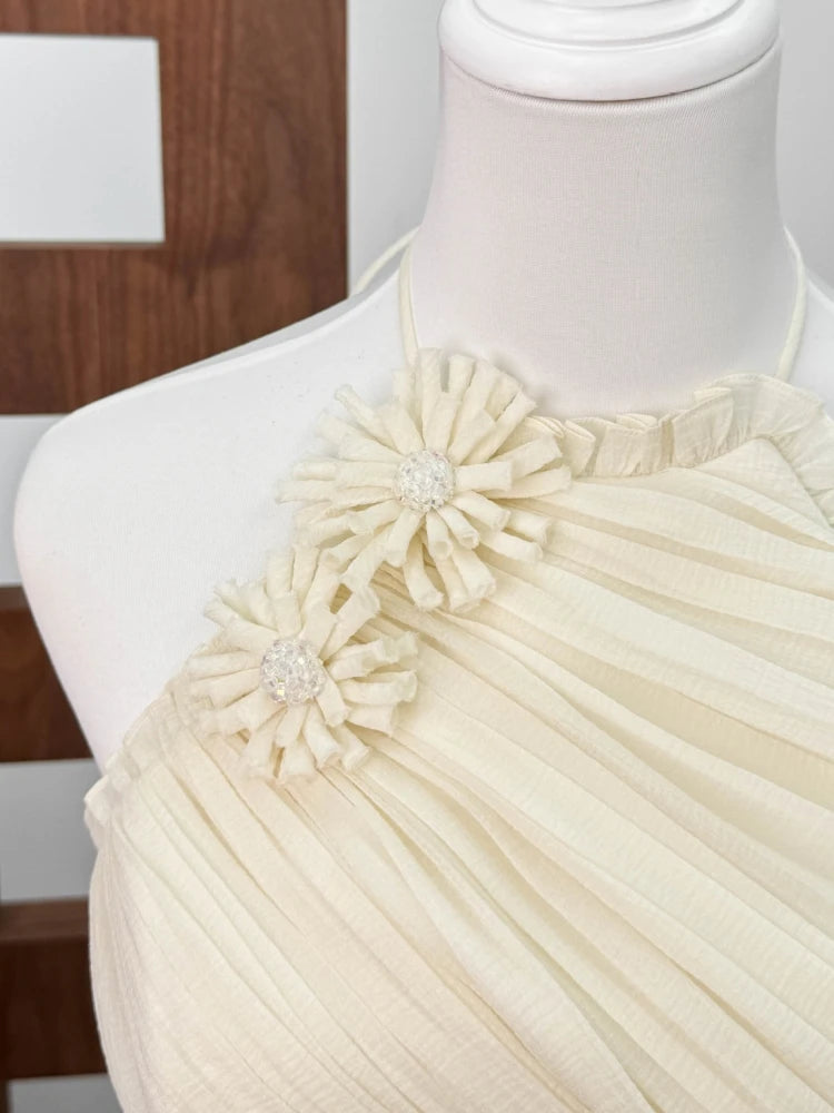 Halter Neck Lace-up Flower Pleated Mini Dress