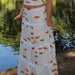Woman wearing a white dress with goldfish pattern by a body of water.