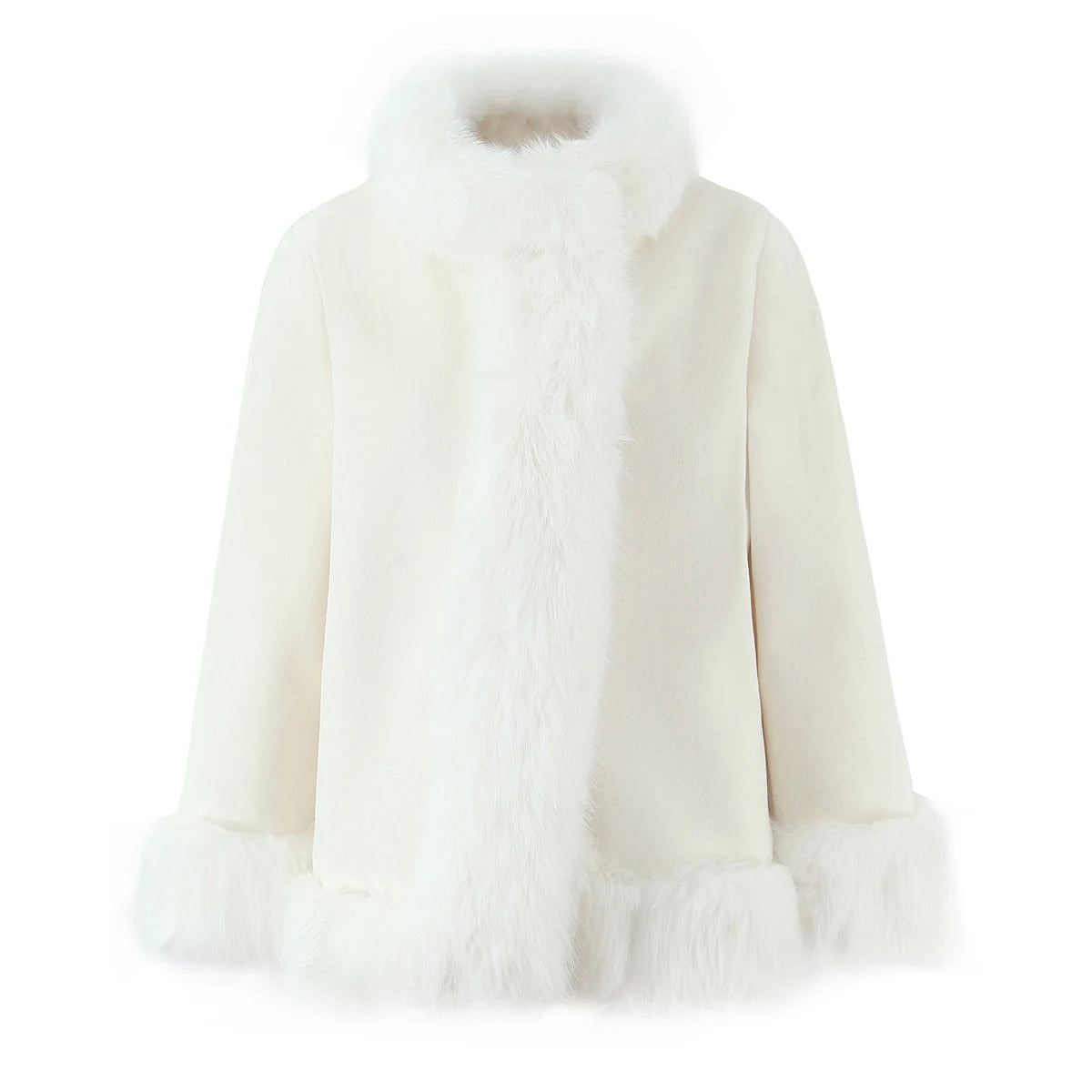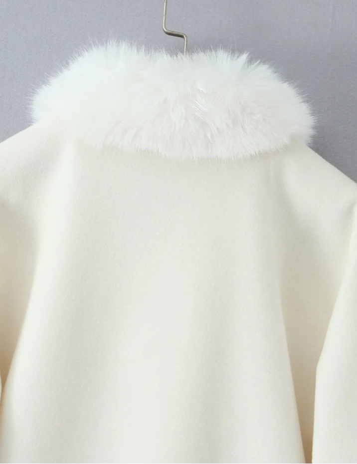 Person wearing a white fur coat in an urban setting with snow on the ground.