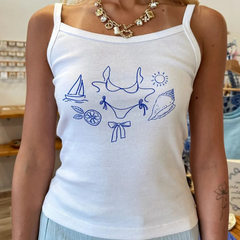 Woman in a store wearing a white top and light blue skirt, surrounded by clothing and accessories.