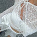 Woman in a white lace dress sitting on a white couch with a scenic background