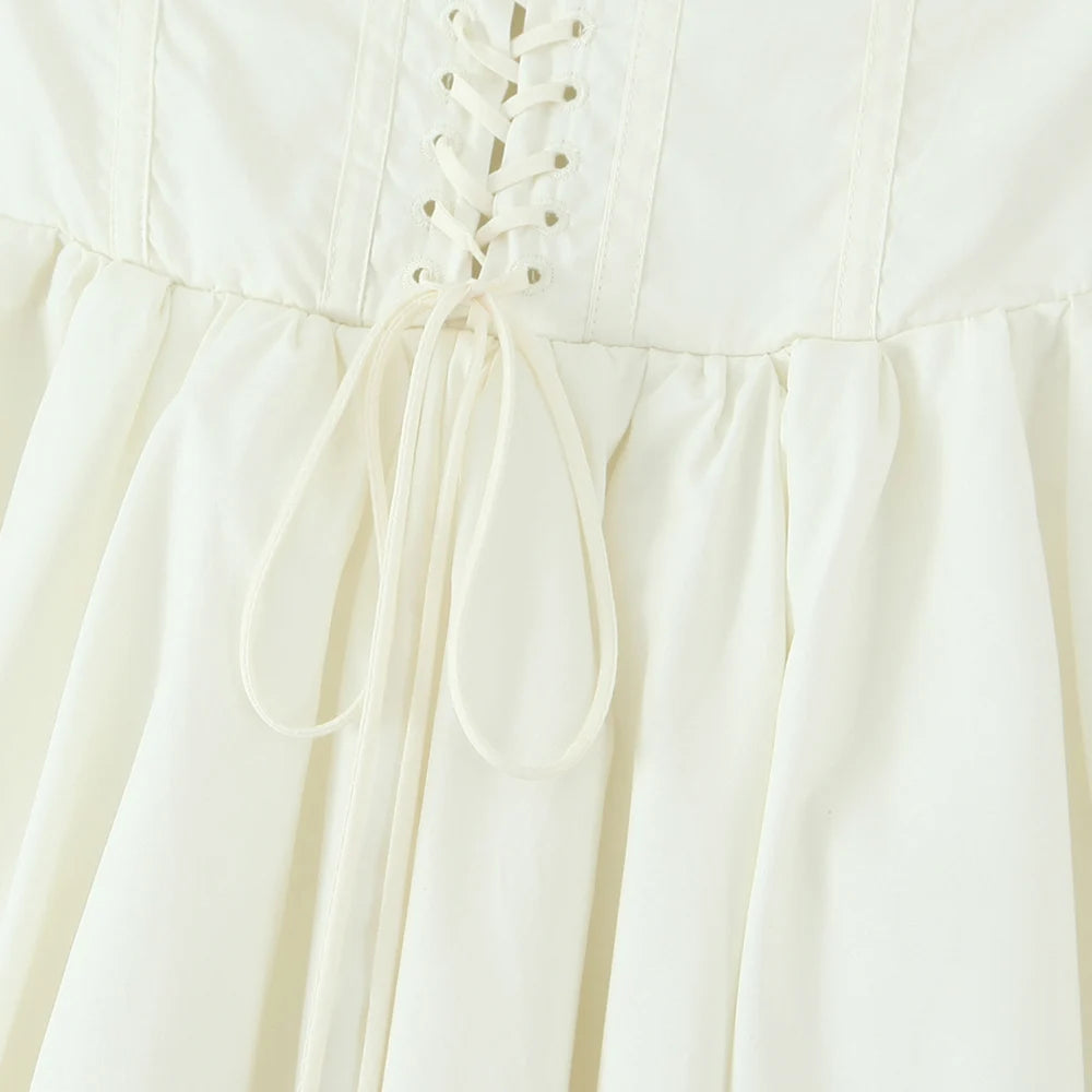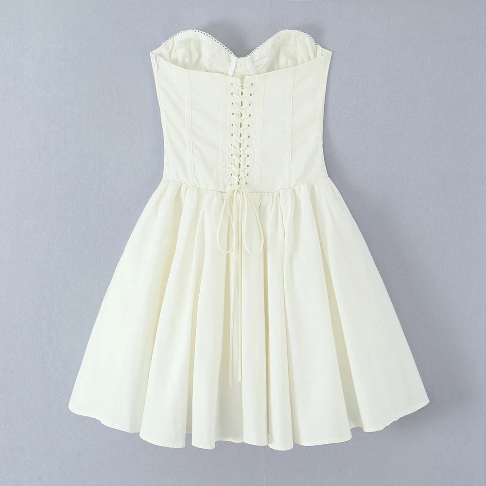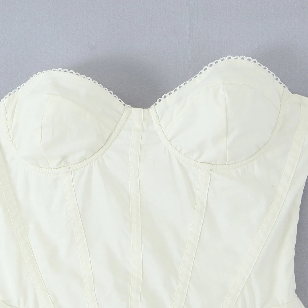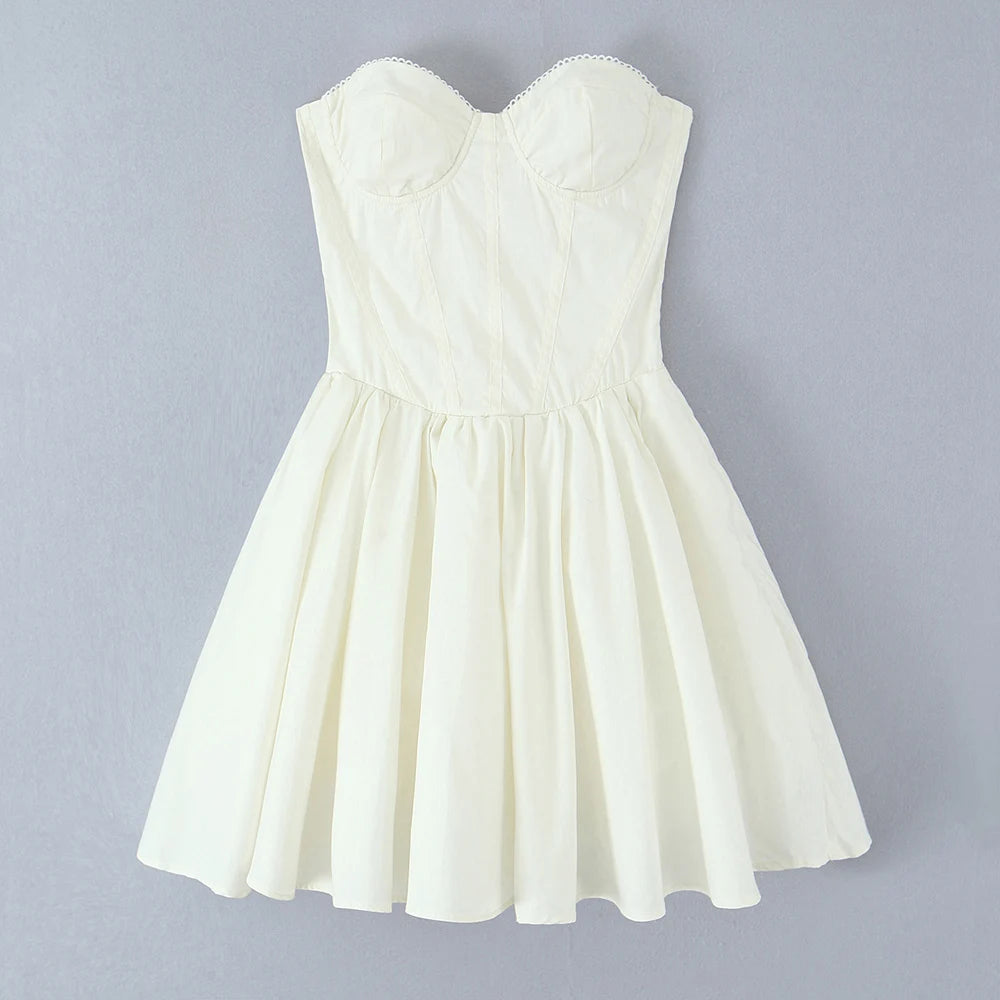 Step out in charming style with our White Solid Flare Bustier Mini Dress, a delightful addition for any adult wardrobe. This elegant dress features a flattering bustier-style top that accentuates your silhouette, combined with a chic flare mini skirt for a playful yet sophisticated look. The crisp white solid pattern makes it a versatile piece for various occasions.