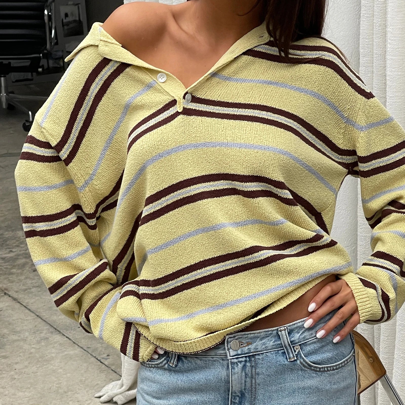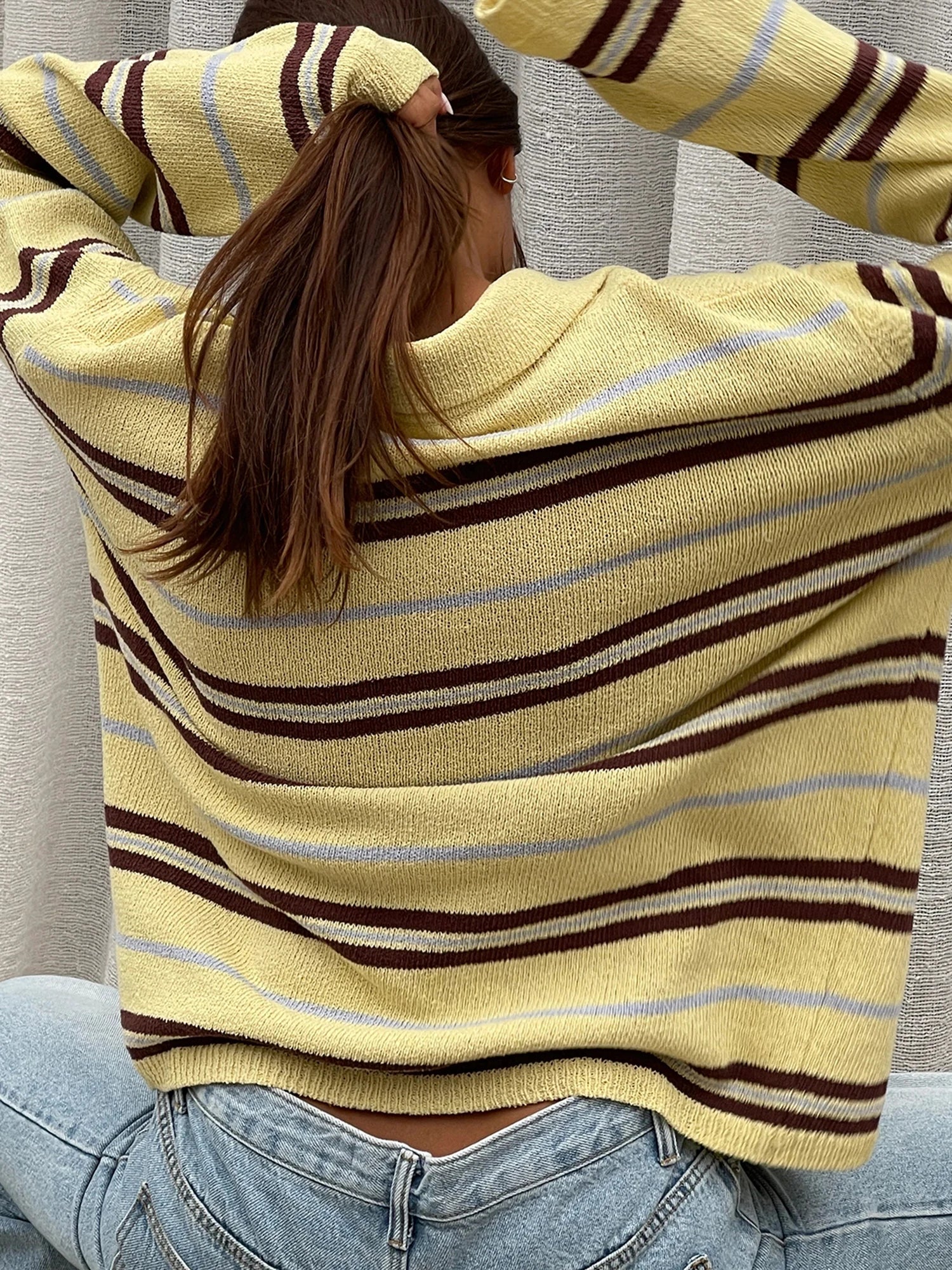 Person wearing a yellow and brown striped sweater with light blue jeans indoors.