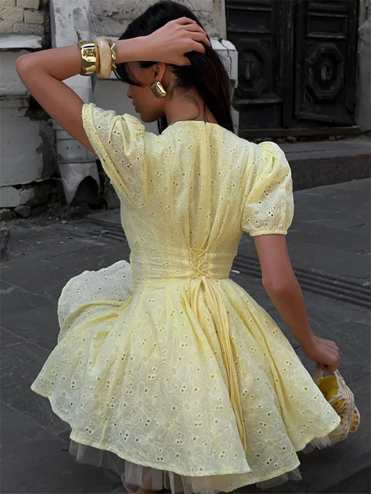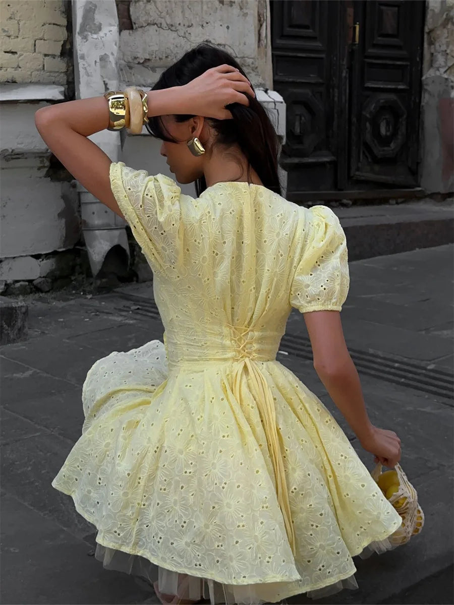 Step into sunny sophistication with our Yellow Tie-Up Puff Sleeve Mini Dress, a vibrant addition for any adult wardrobe. This eye-catching dress features a flattering V-neckline and charming half-length puff sleeves, adding a touch of feminine elegance. Stylish tie-up details (implied by title, "Lace-up" decoration in specs) allow for an adjustable and decorative touch, while the bright solid yellow pattern ensures a cheerful presence.